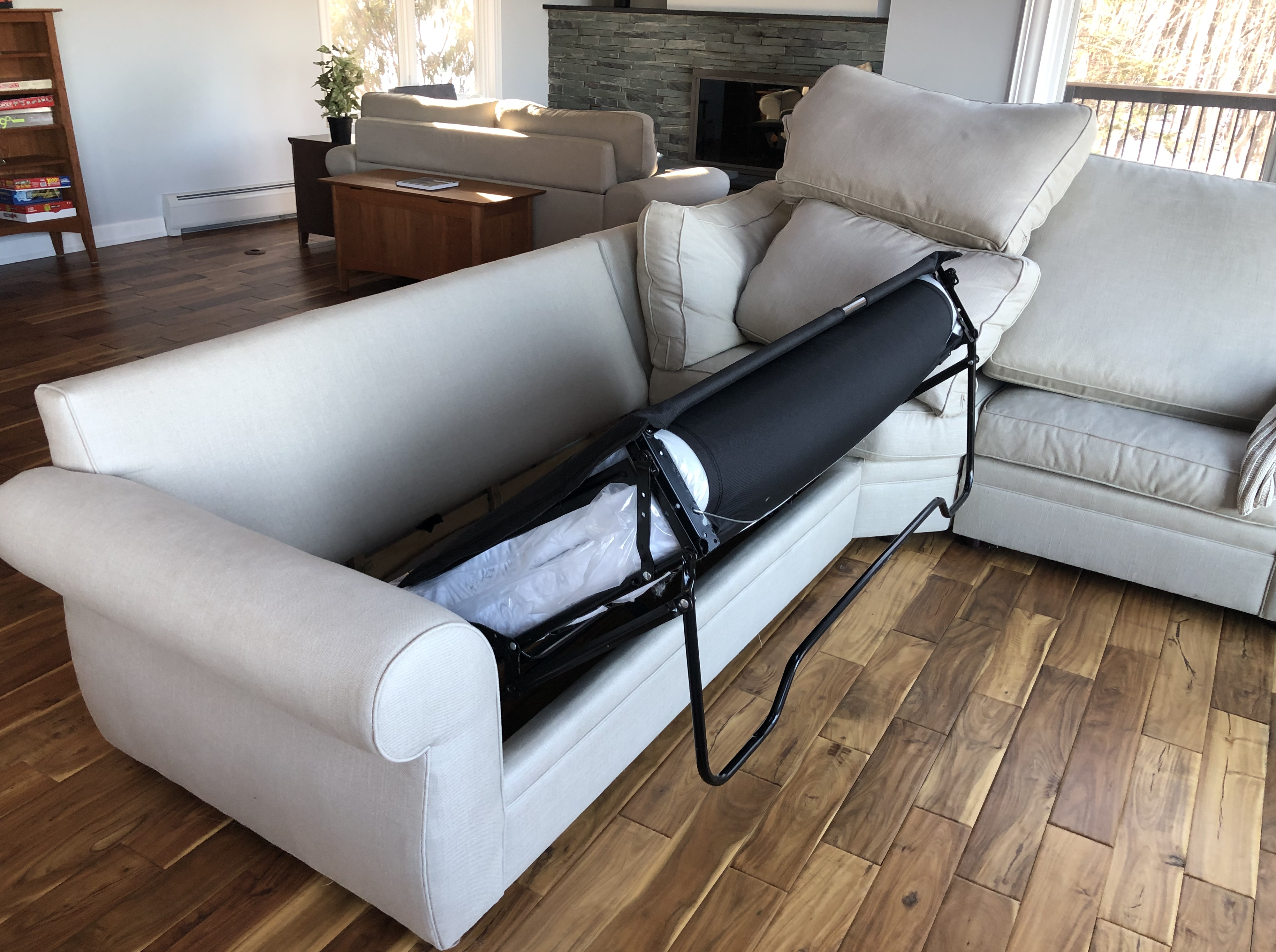 4. Both sofas in the dining room and living room expand into beds. When finished, simply fold the bed back in the same motion, and carefully hold the handle to slide it back into place.