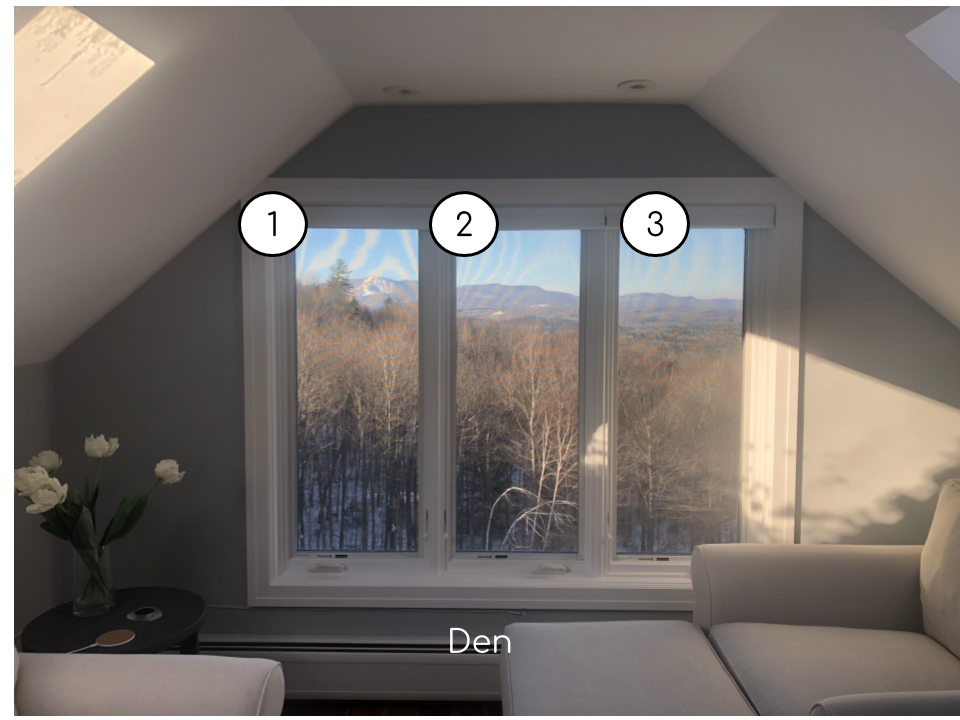 The shades in the den can be operated manually, from a remote control, or from Alexa.